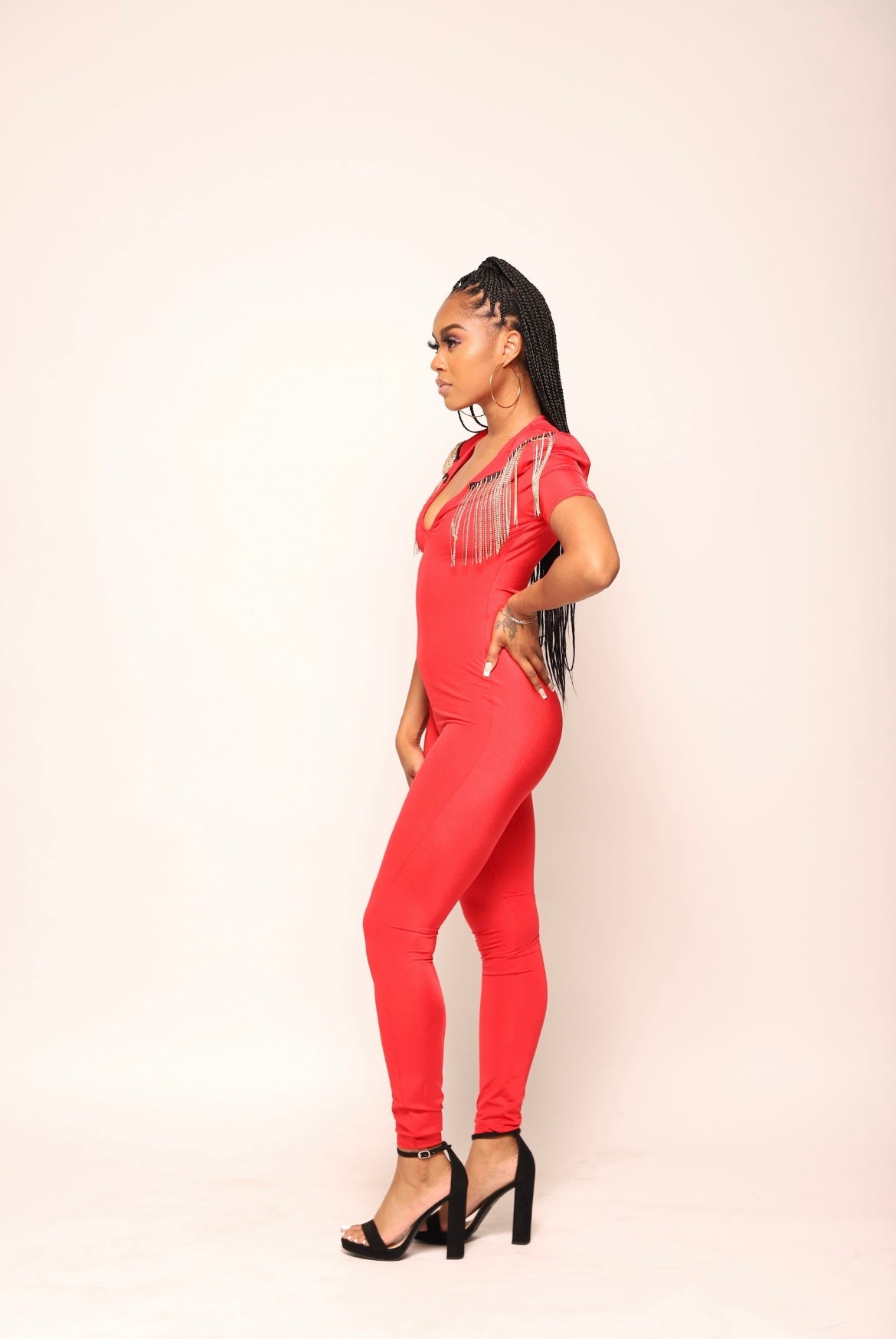 Absolutely perfect for the holidays! Vibrant red jumpsuit with gold chain detail on front. Slightly low cut to reveal just the right amount. Short sleeved.