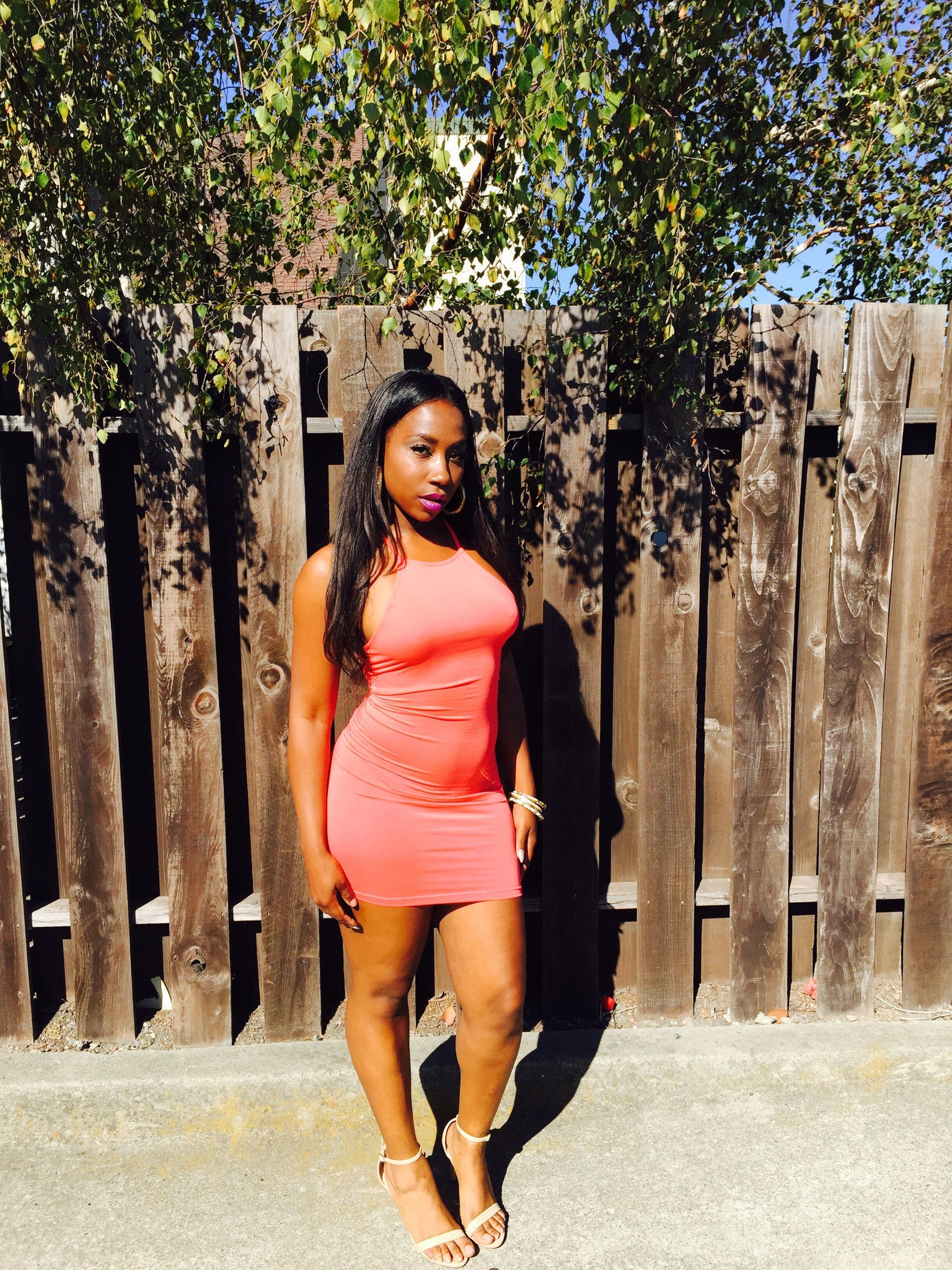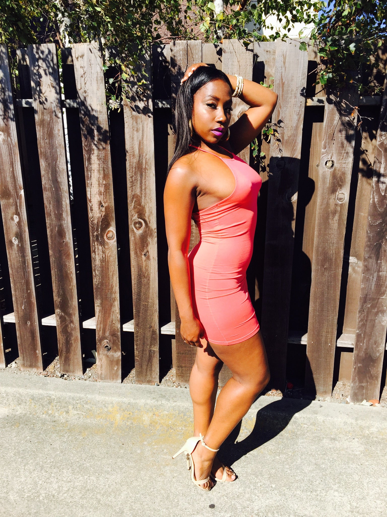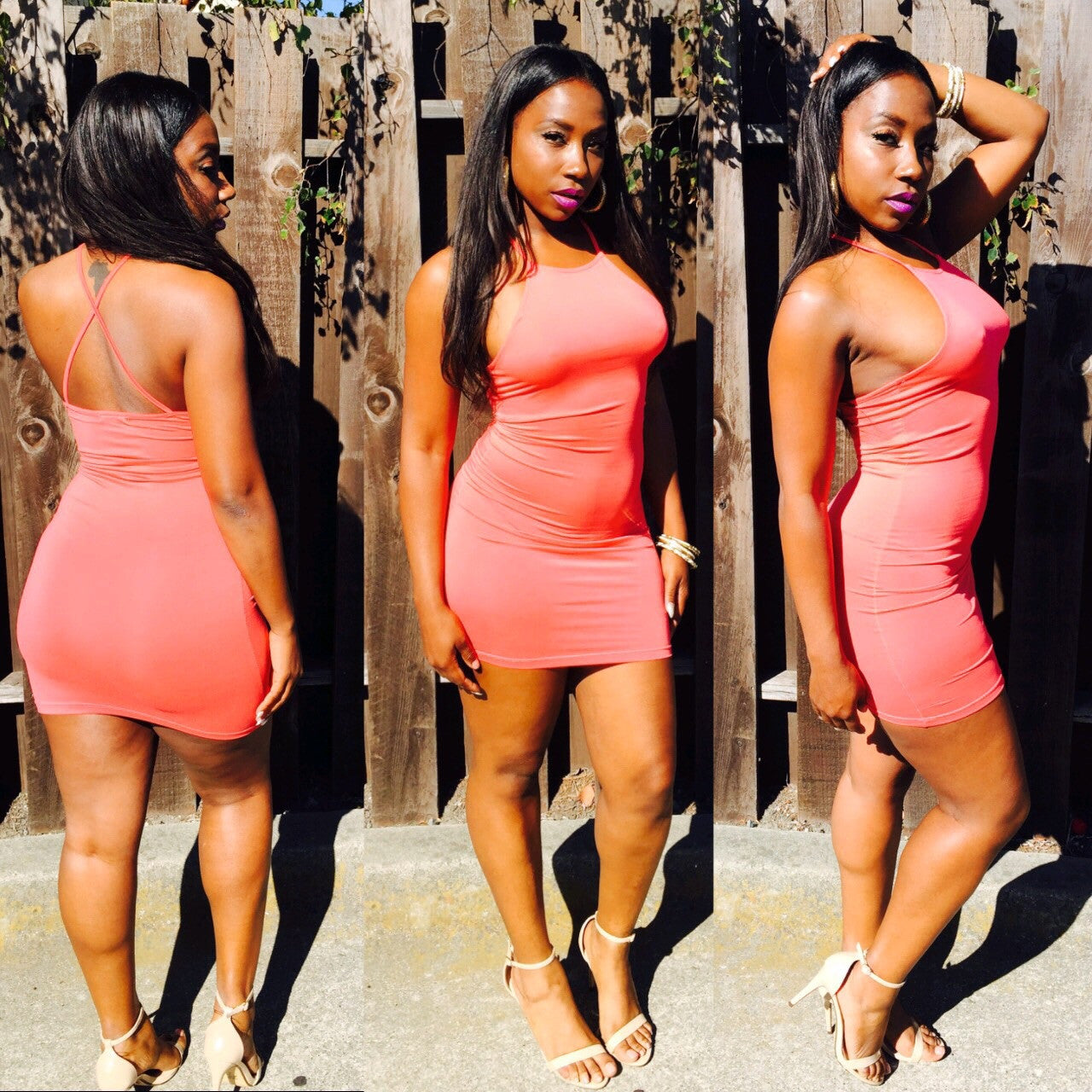 Show a subtle amount of sexy in our CrossBack Dress! Coral in color with straps that cross at the back. Curve hugging. 87% Polyester, 13% Spandex. Small, Medium and Large Available. Model is wearing a Medium.