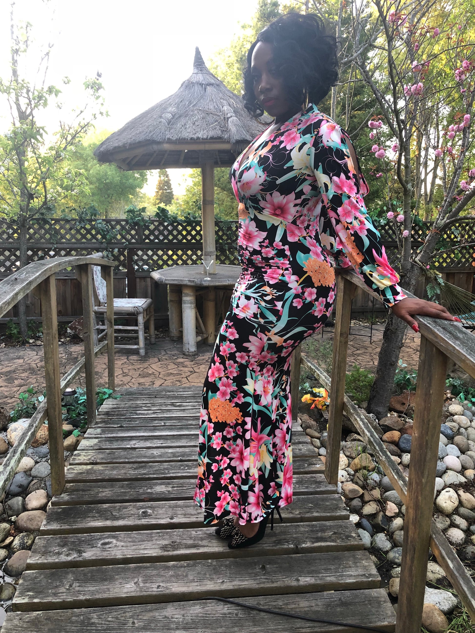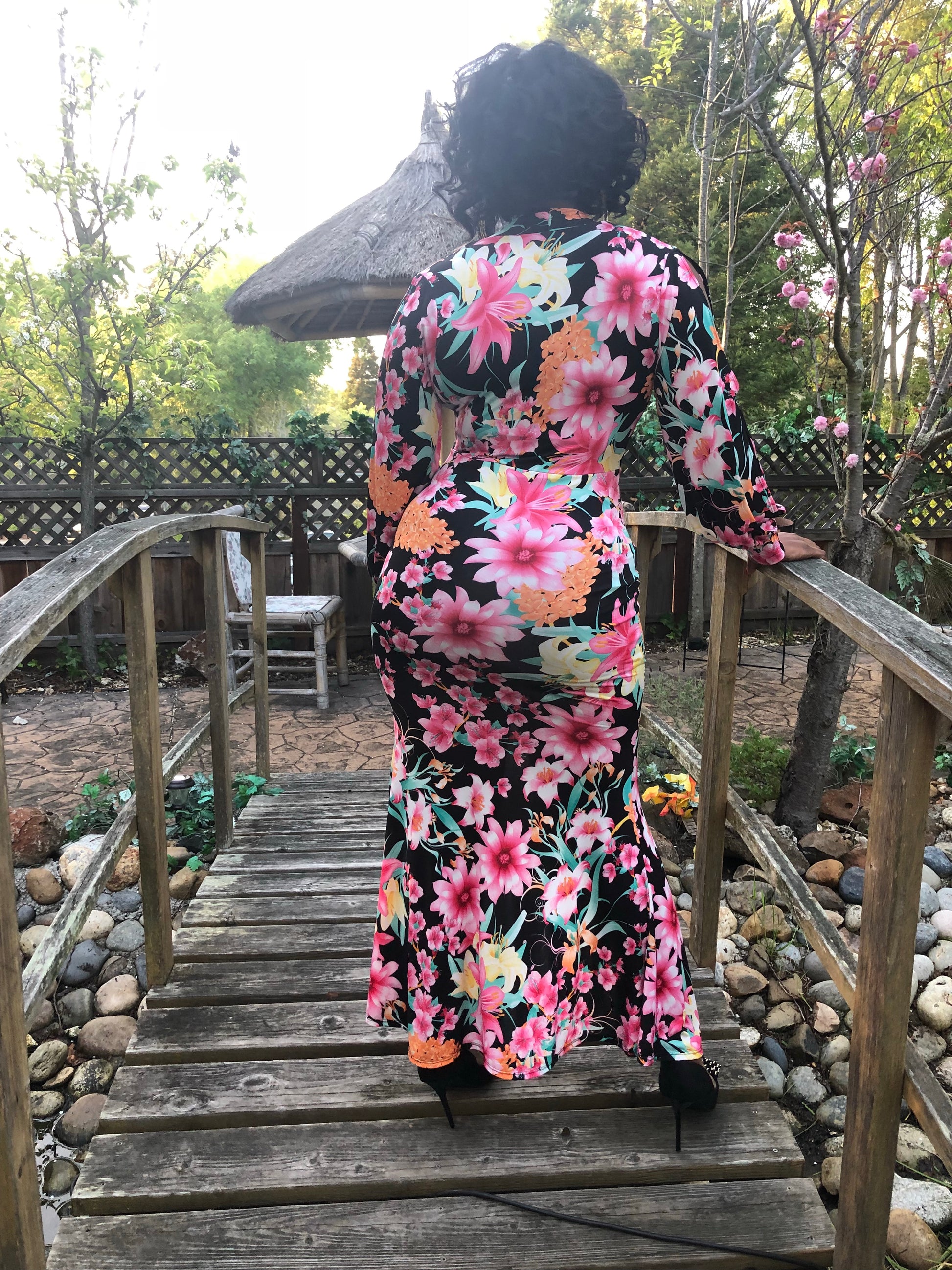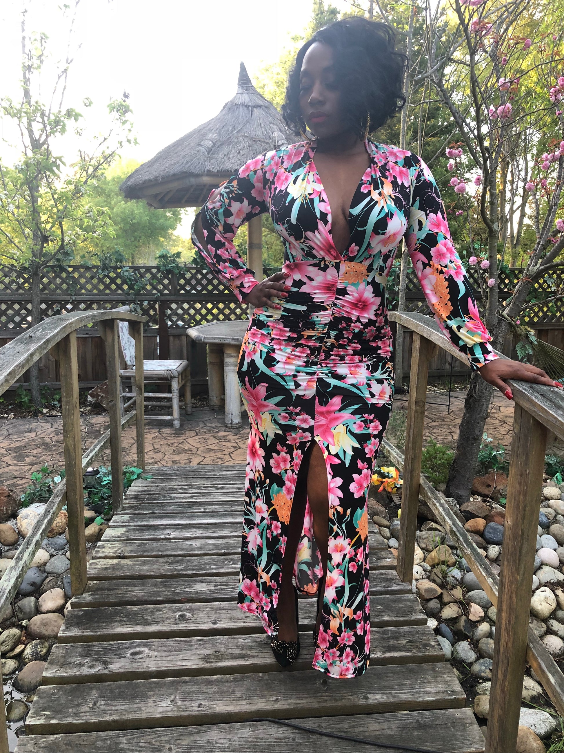 Very pretty floral maxi dress. Features a plunging neckline, ruched Skirt portion, slit in front of dress and also in sleeves to expose arms and skirt is lined. 98% Polyester, 2% Spandex. Very flattering on the frame! ⌛️ A must for Spring/Summer 💐💐💐