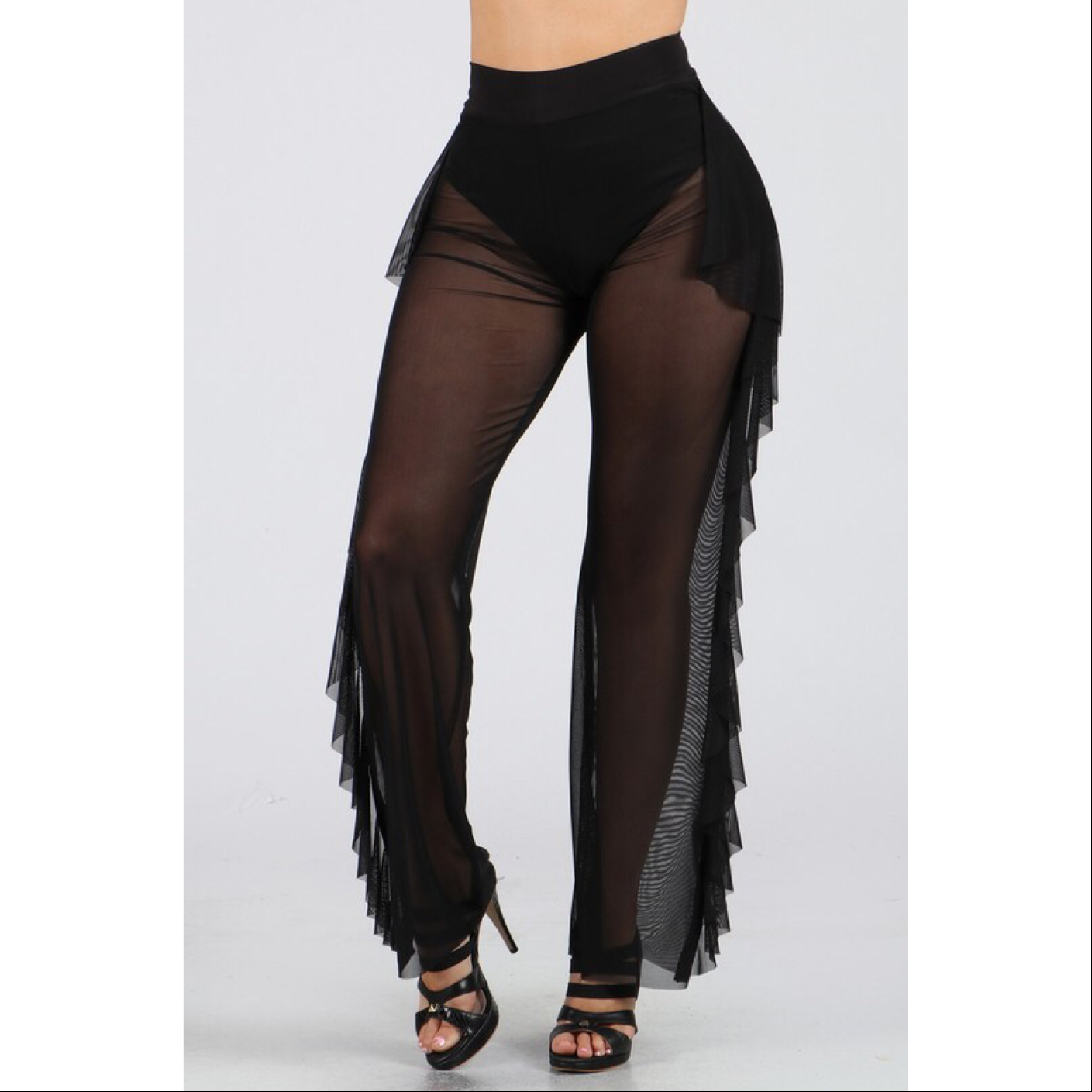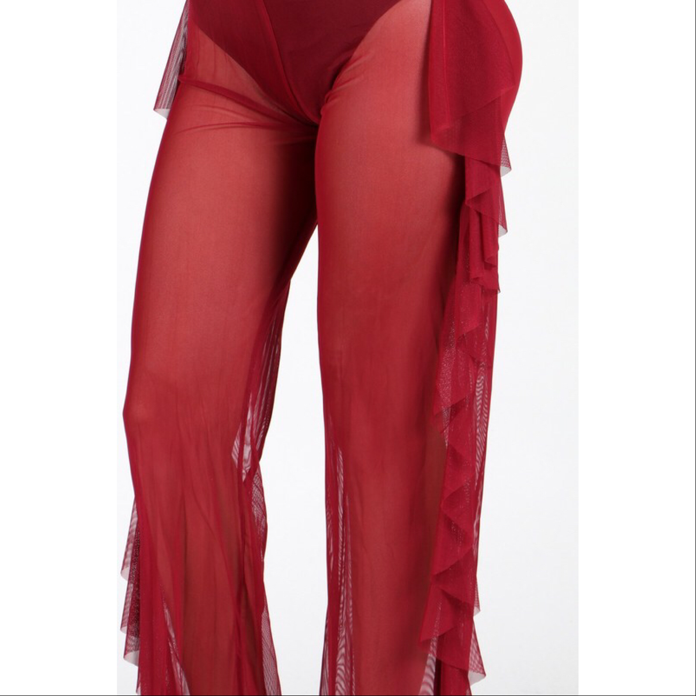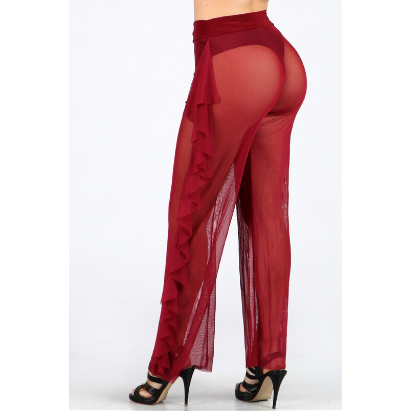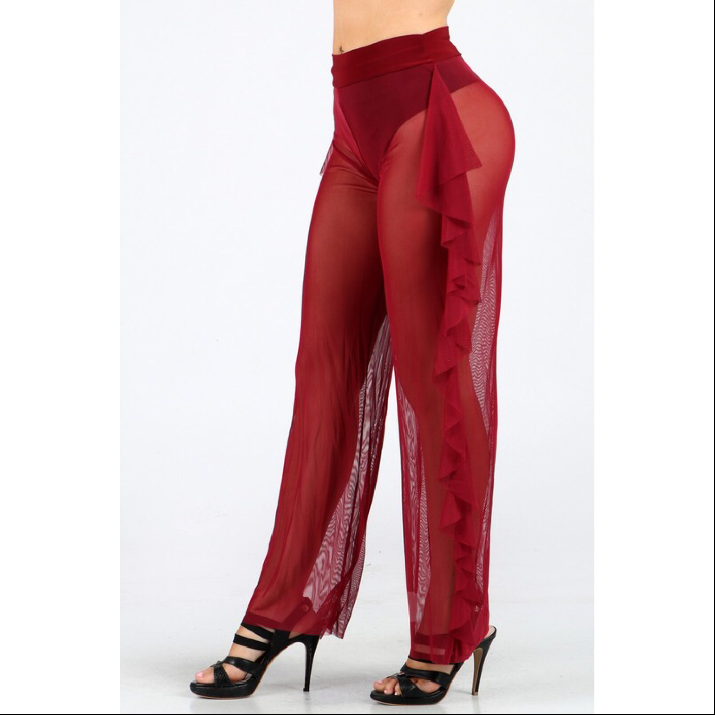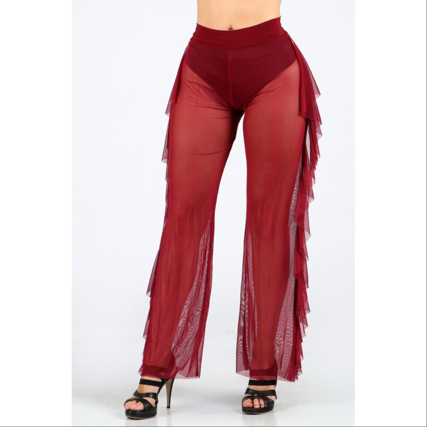 Very popular and very trendy sheer mesh pants with ruffle accents on the side. High waist fit and stretchy. Available in black and burgundy.