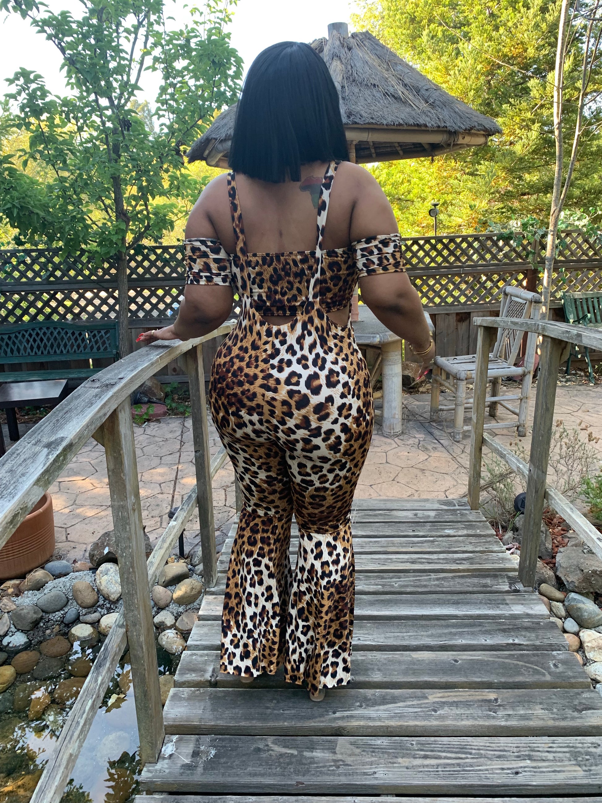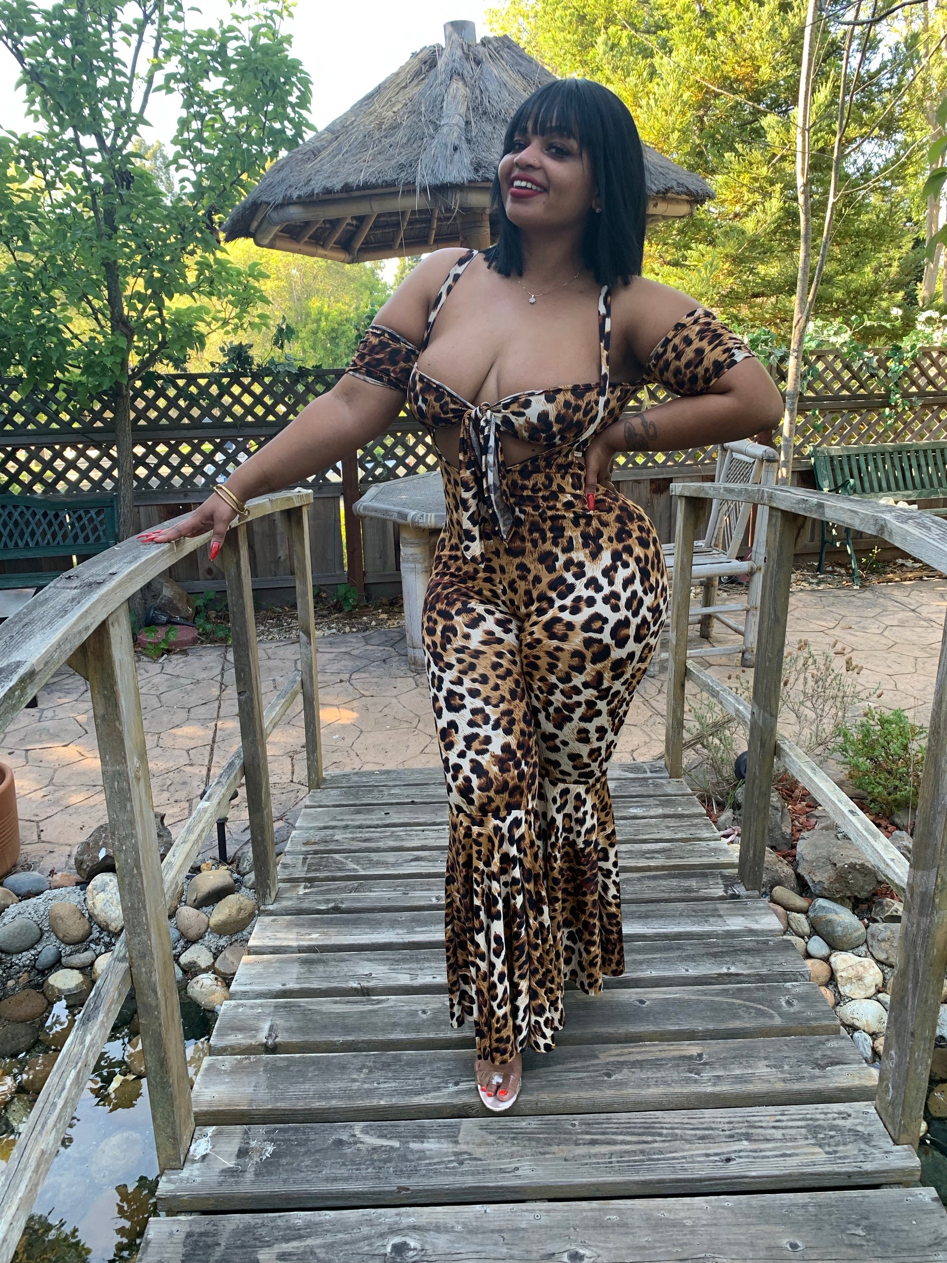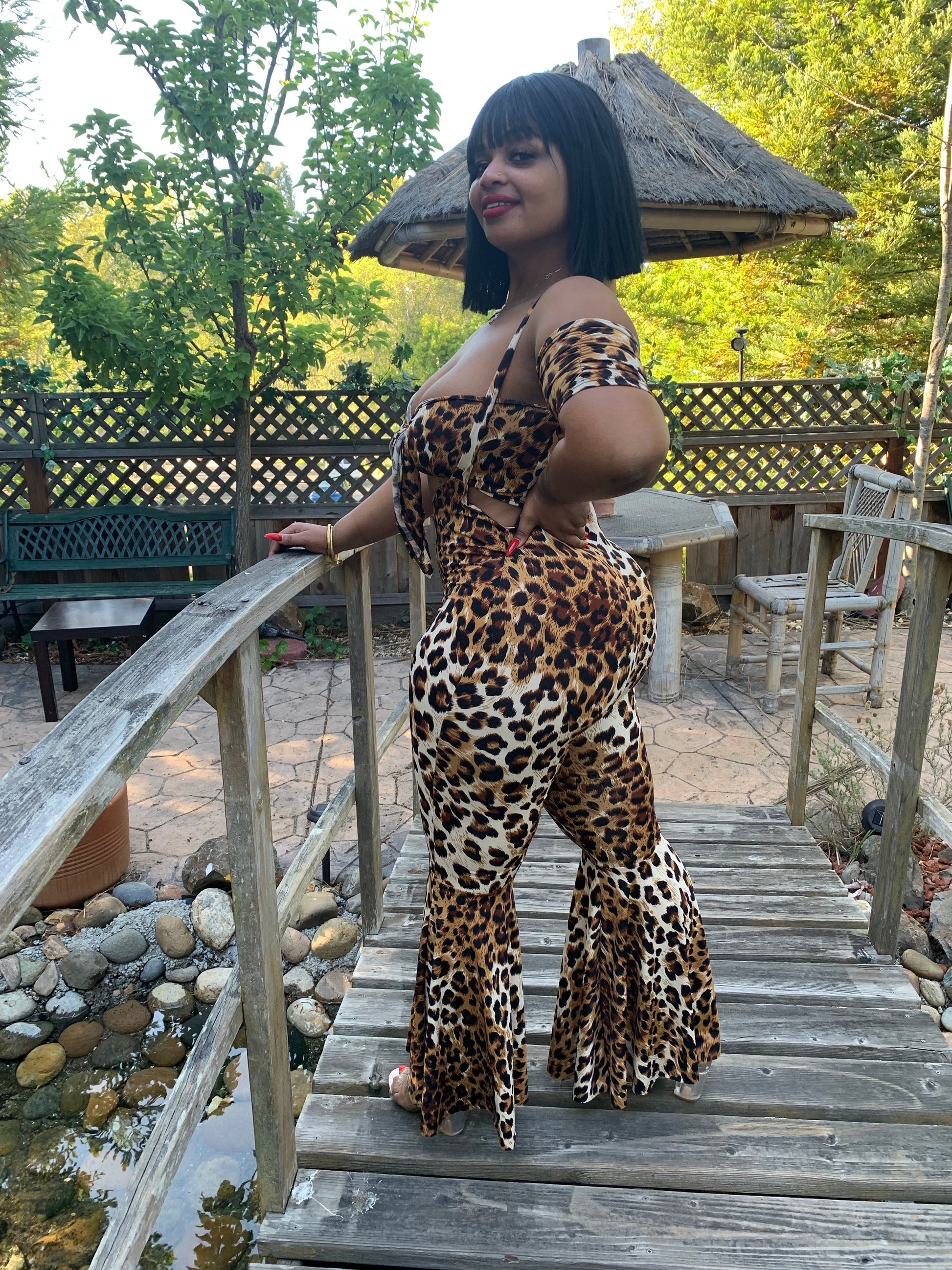 Bomb set coming thru! Top is Bandeau style with from tie to adjust cleavage. Bottoms are bell bottoms with suspender top. All in an awesome leopard Β print! Fair amount of stretch.
