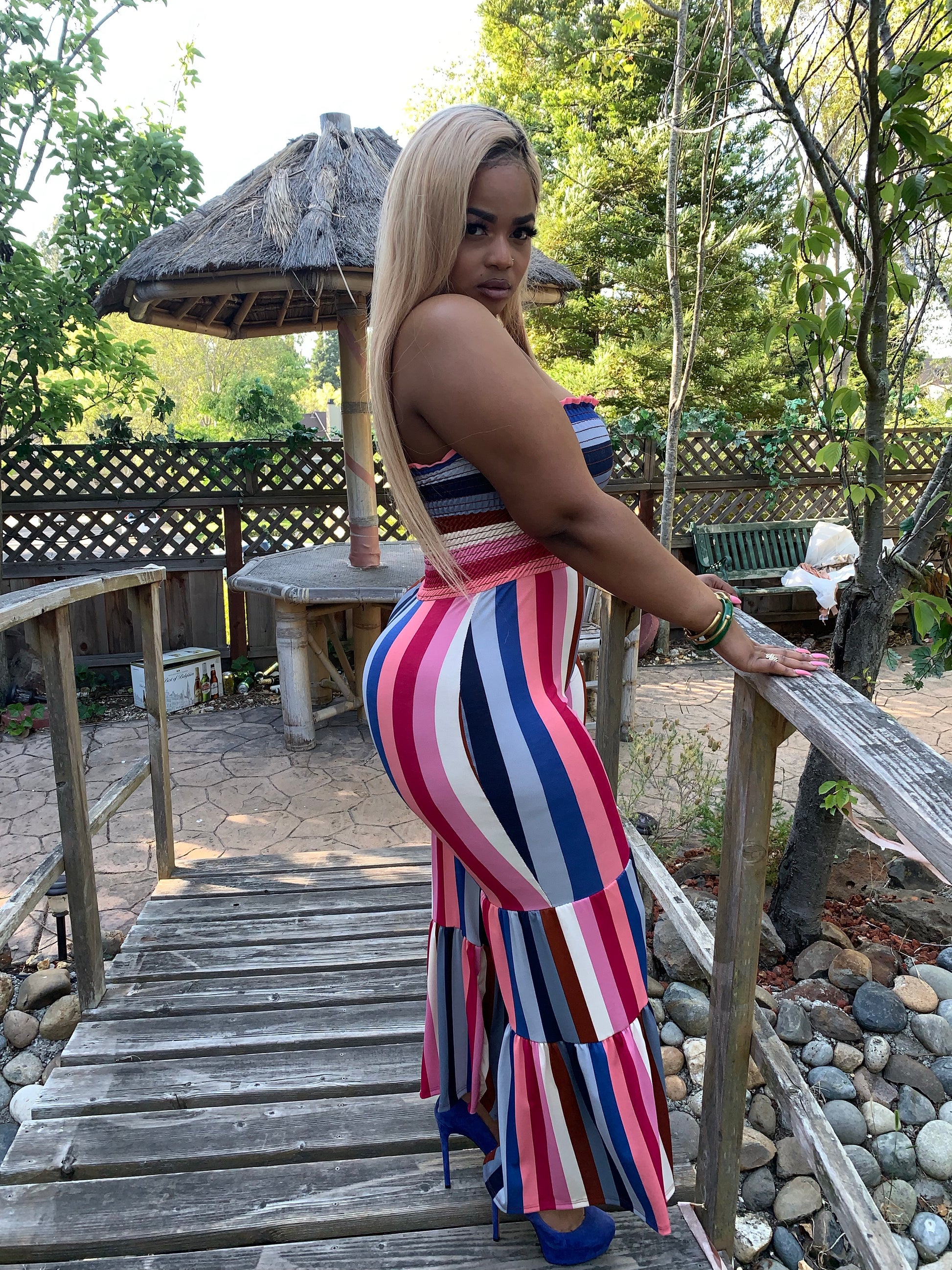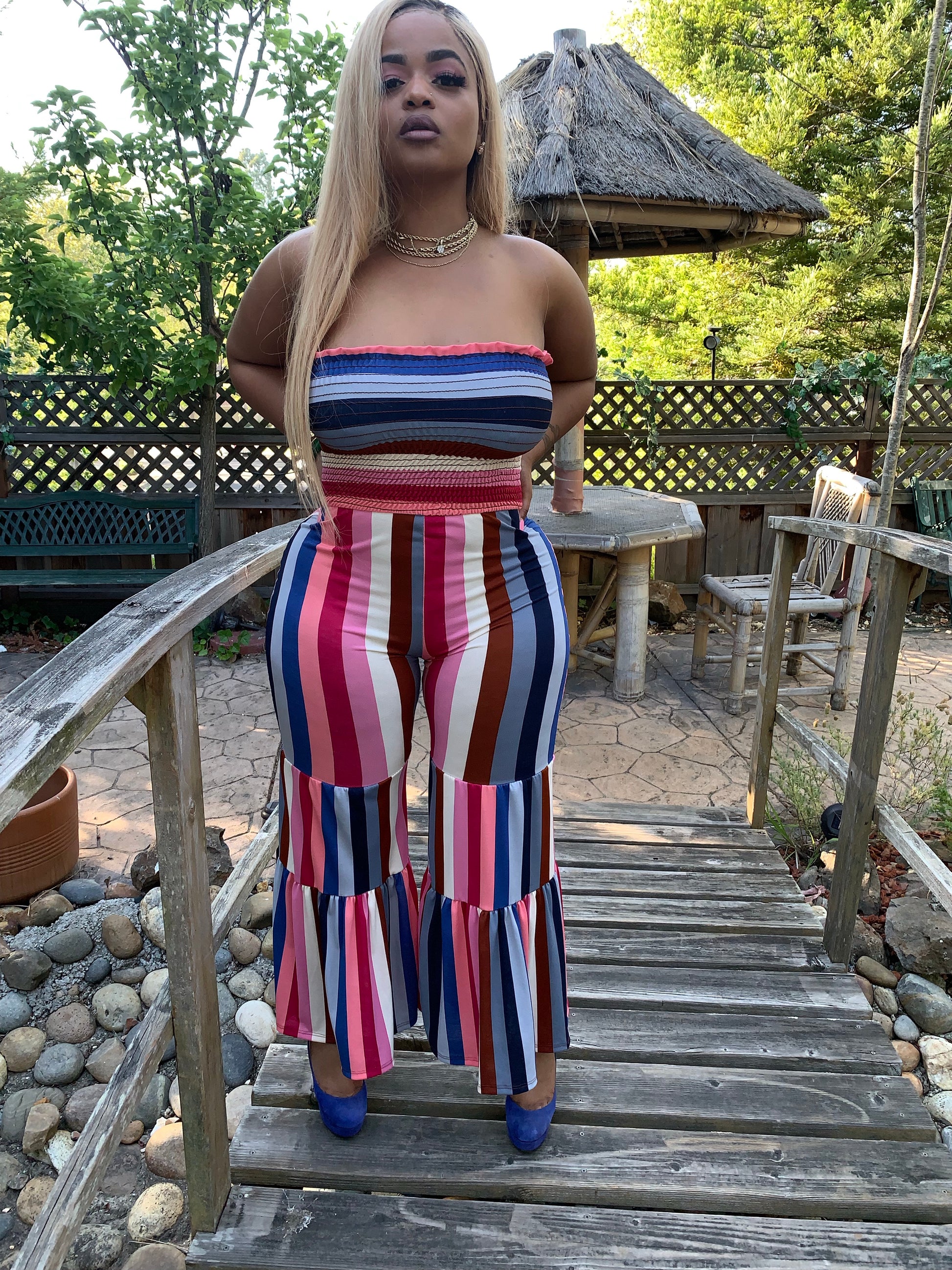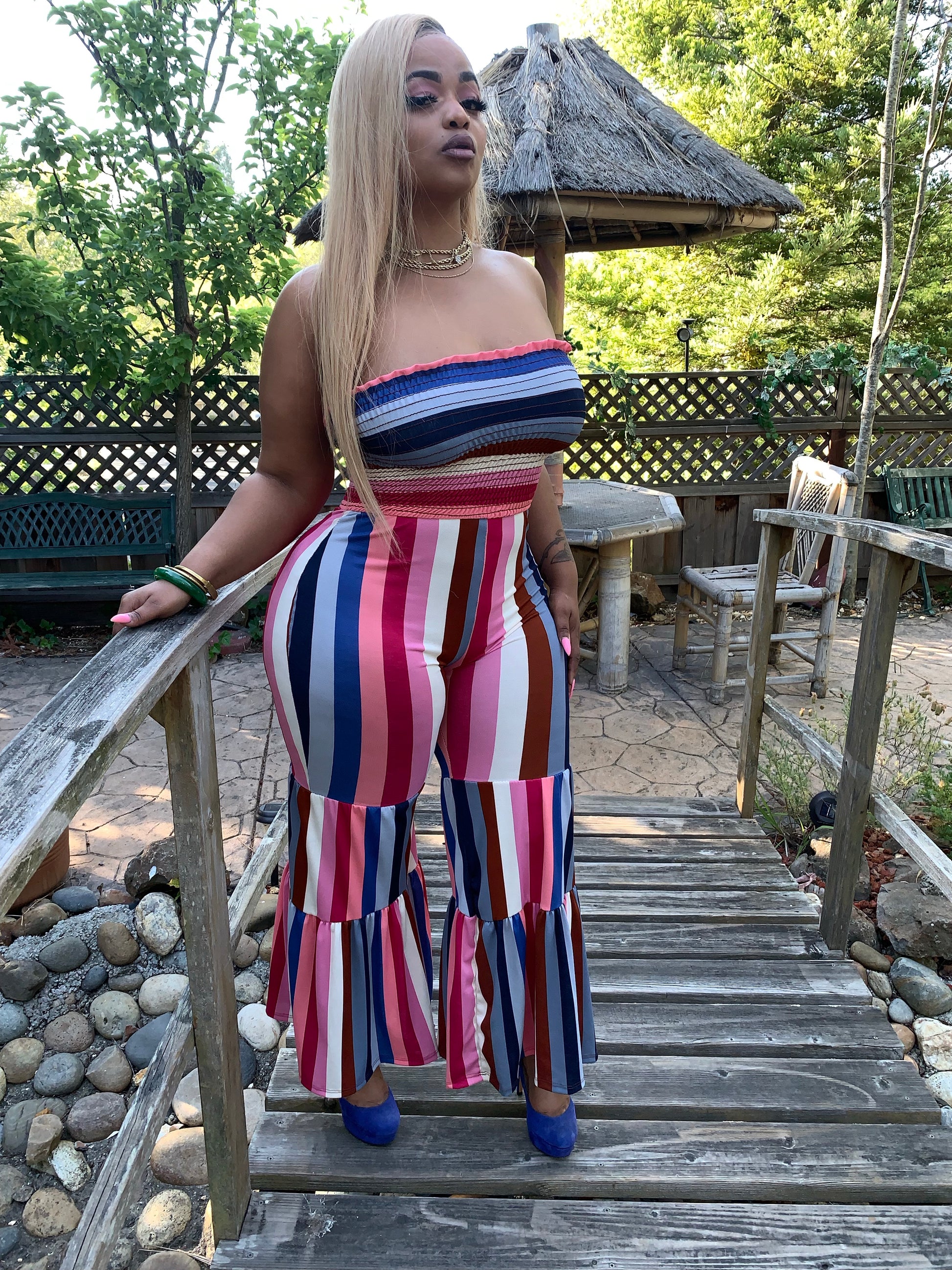 Issa show in our Stripe Me Down Jumpsuit! Strapless tube top style bodice and tiered wide leg pants in a super pretty multicolored, striped pattern. Has stretch and hugs you in all the right places. Runs true to size. Model is wearing size Large.