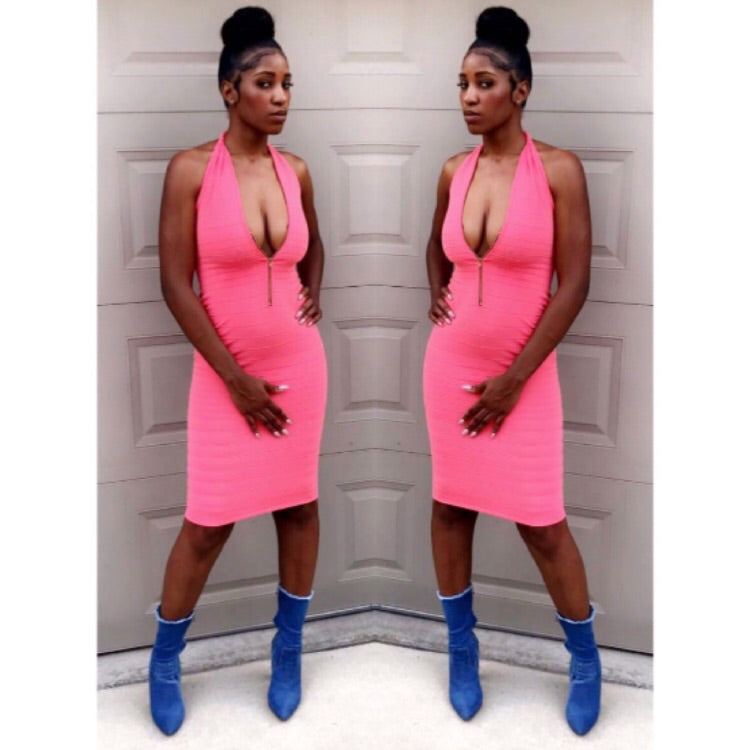 Halter bodycon midi dress in coral color. Features zippered front and textured stripes. Semistretch, model is wearing size small.